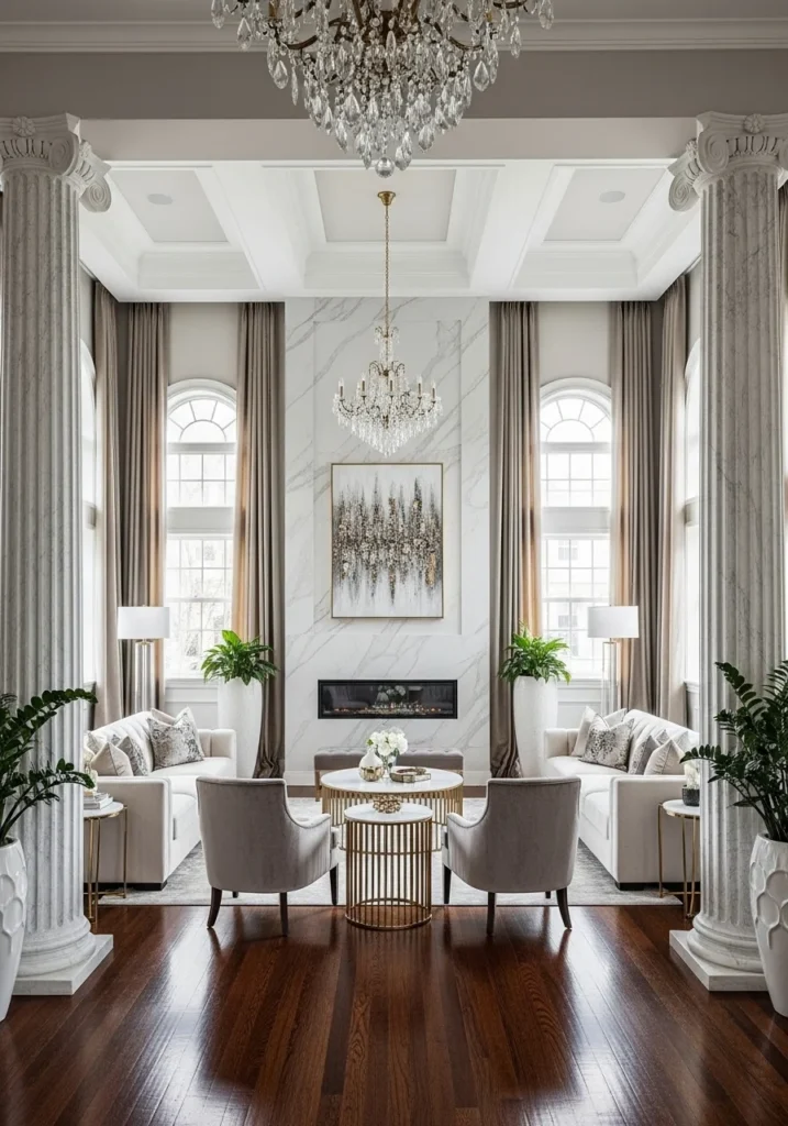 This modern classic living room features graceful classic columns that evoke palace-inspired elegance. Contemporary furniture softens the formal architectural elements, creating a balanced fusion of tradition and modernity. The design emphasizes symmetry, proportion, and refined detail.