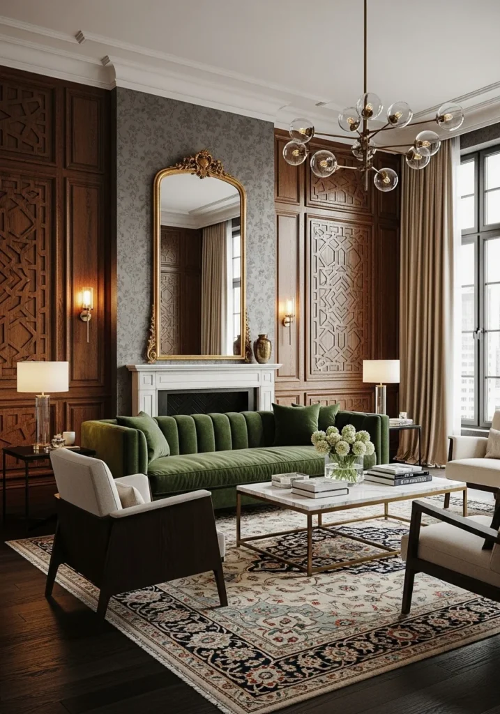 This modern classic living room features decorative wall panels that introduce architectural depth and refined symmetry. The classic detailing provides a structured framework, while modern furniture adds clarity and functional comfort. Together, these elements create a harmonious and sophisticated interior.