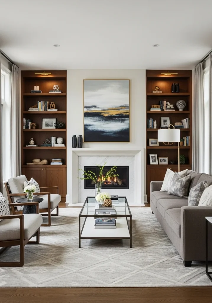 23. Modern Classic Living Room with Fireplace and Built-In Shelves