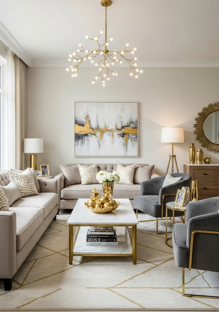 This modern classic living room features muted gold accents that subtly elevate elegance without overwhelming the serene interior. Ivory tones form the foundation, creating a soft, luxurious backdrop that allows the gold detailing to shine with sophistication. The design balances warmth, refinement, and contemporary classic style.
