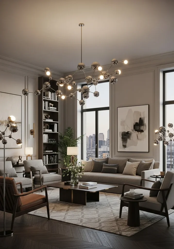 This modern classic living room is distinguished by sculptural lighting fixtures that serve as both functional elements and artistic focal points. Subtle ornamentation and contemporary classic fusion design principles harmonize with the lighting, creating a visually compelling and sophisticated environment.
