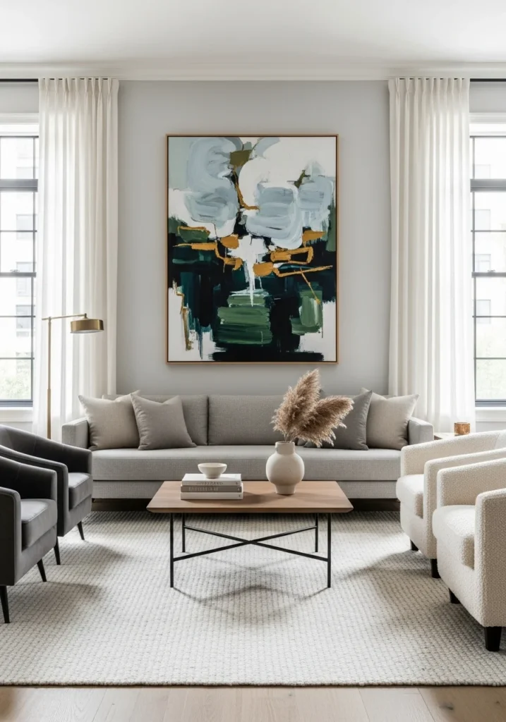 This stylish modern classic living room is elevated by bold statement art that introduces personality and visual intrigue. A neutral palette ensures balance, allowing the artwork to command attention while maintaining refined elegance. The design achieves harmony between artistic expression and classic sophistication.