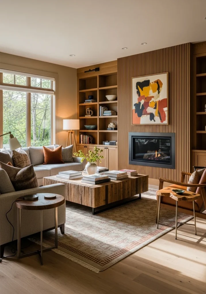 This warm modern classic living room incorporates rich wood accents that introduce warmth, texture, and natural elegance. Premium materials, soft textiles, and thoughtful detailing create a sophisticated yet inviting environment, blending classic architecture with contemporary refinement.
