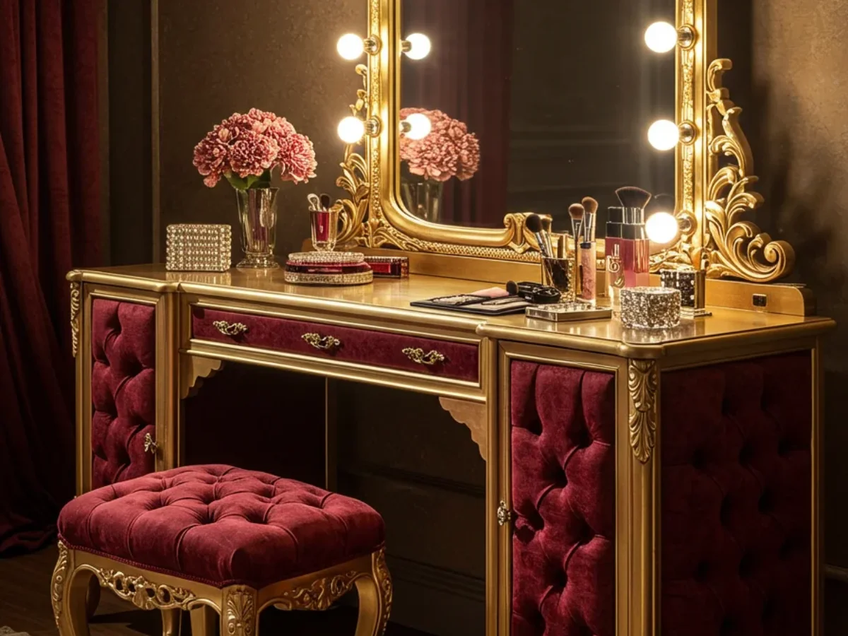Luxury makeup table with upholstered panels and gold trim