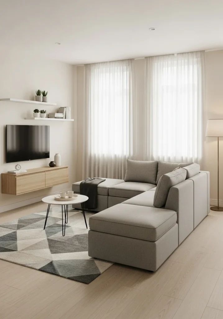 This compact contemporary living room exemplifies the art of efficient elegance. Neutral colors—soft beige, ivory, and greige—expand the visual space, while multifunctional furniture maximizes functionality without compromising style. Smart design choices, such as built-in shelving and modular seating, maintain openness and order. The layout feels intentional and airy, using light and proportion to create a sense of calm sophistication.
