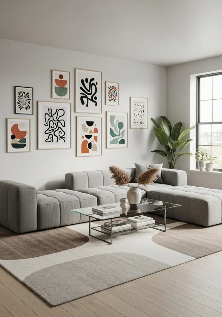 Contemporary apartment interior with modular sofa, glass coffee table, and art prints