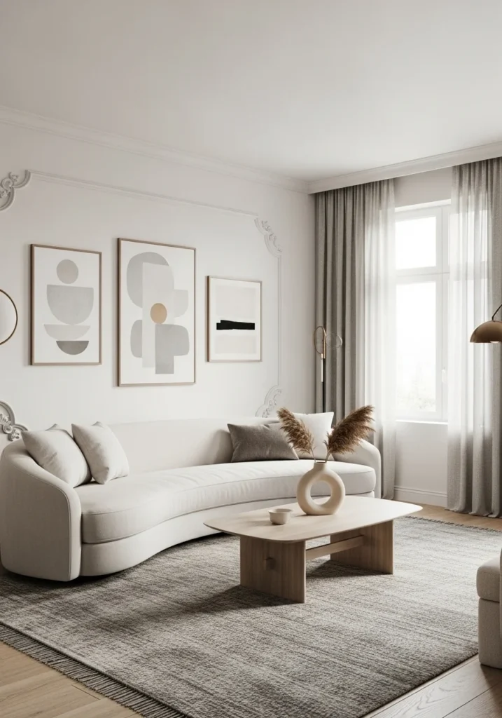 Contemporary living room with neutral palette, curved sofa, and minimalist wall art