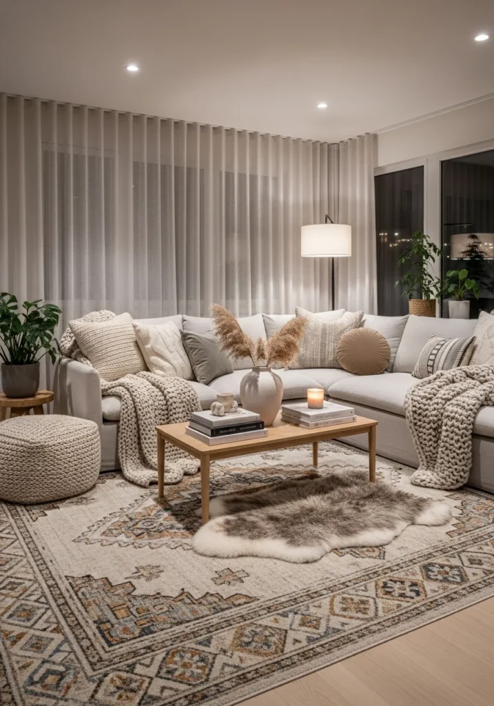 Cozy contemporary living area with layered textiles, statement rug, and soft lighting