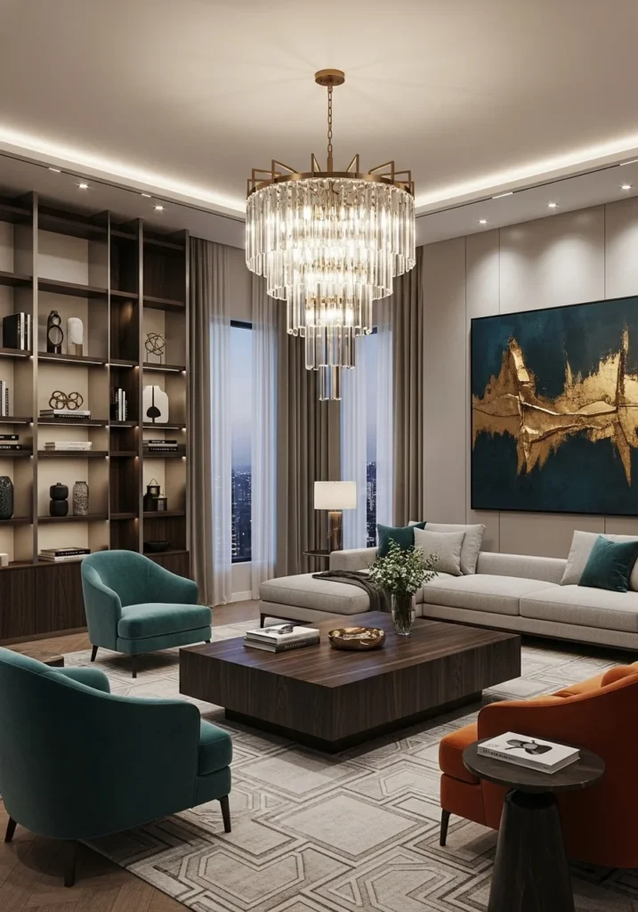 Luxurious modern living room with statement lighting and designer furniture