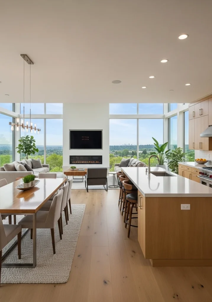 Open-concept living space with floor-to-ceiling windows and light oak flooring