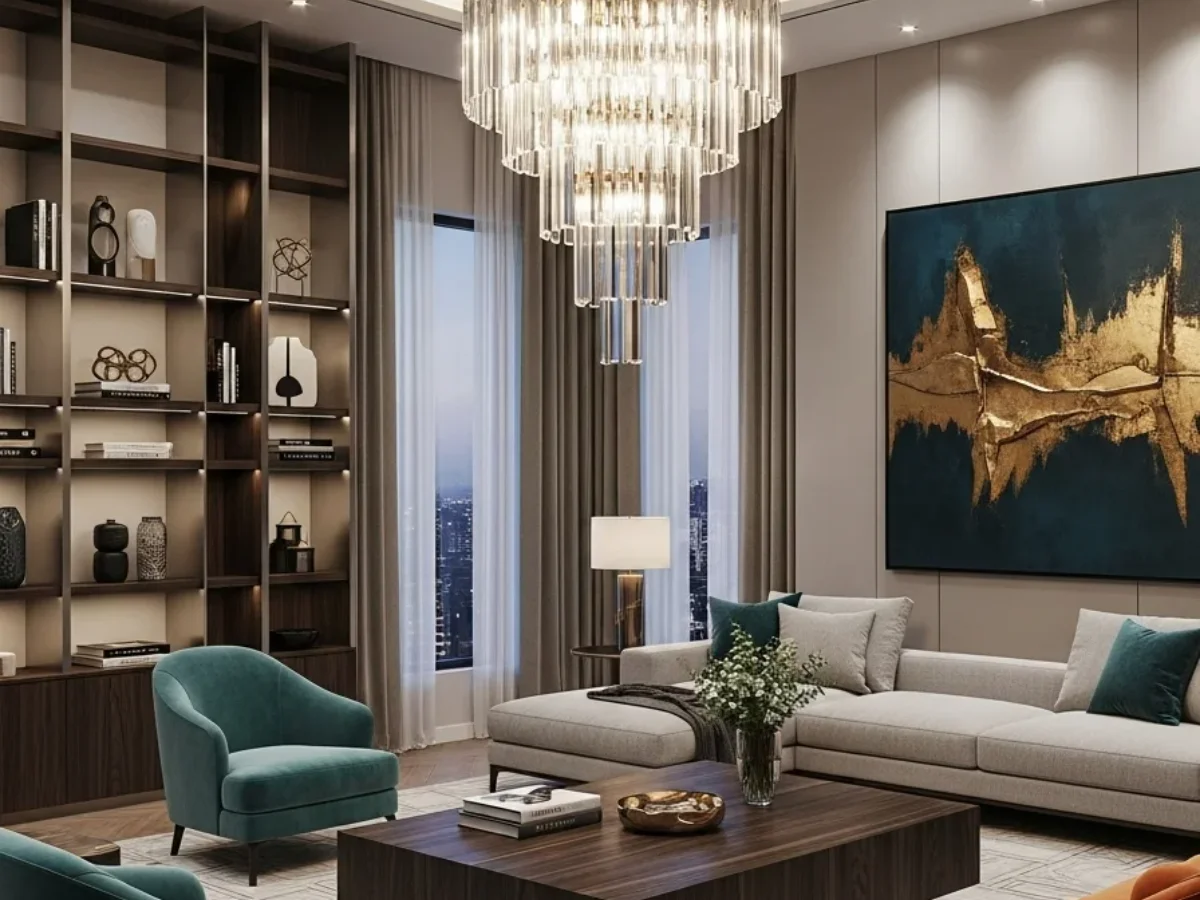 This luxurious modern living room redefines contemporary opulence through precision and artistry. Statement lighting becomes the focal point—sculptural chandeliers and ambient fixtures illuminate the space with golden warmth. Designer furniture, crafted with impeccable attention to detail, anchors the room in sophistication, blending comfort with refined aesthetics.