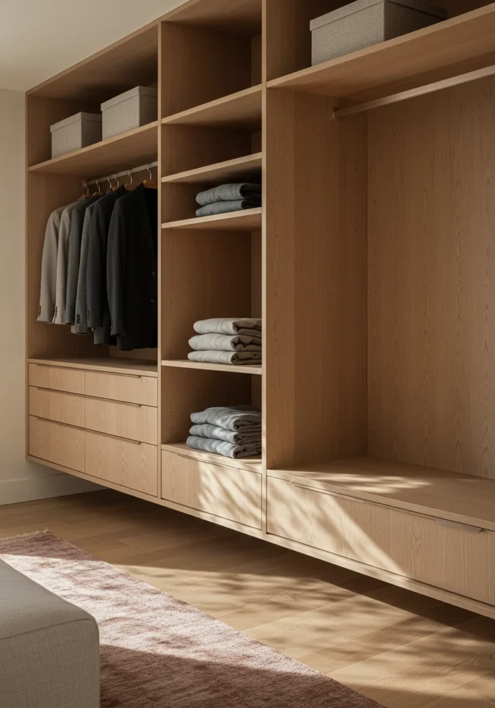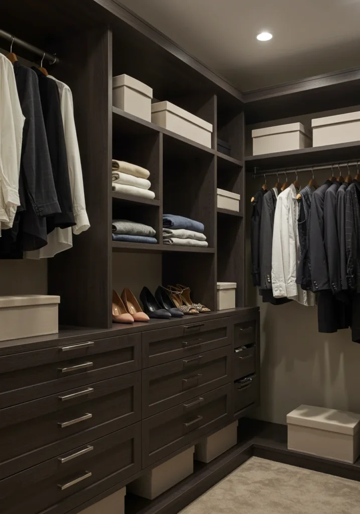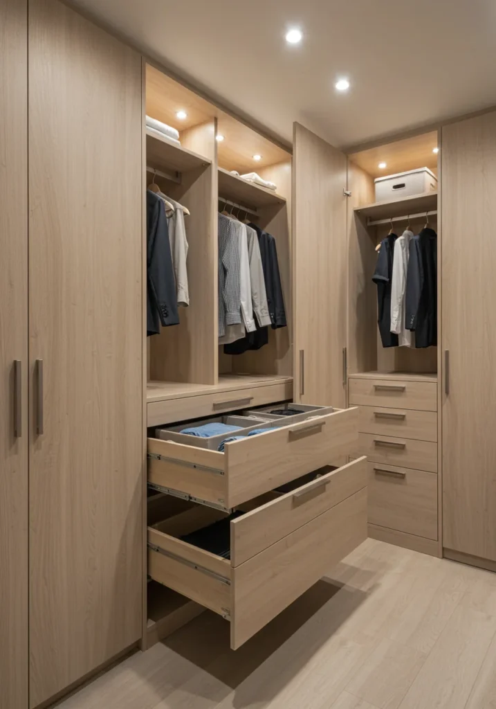 A built-in closet with pull-out drawers and organizers is a practical choice for small spaces, offering tailored storage without clutter. The built-in design maximizes wall space, while pull-out drawers and compartments ensure every item is accessible. Organizers for shoes, accessories, and folded clothes keep belongings neat and easy to find. Finished with sleek doors or left open for a modern display, this closet adapts to different interiors. Its streamlined appearance makes it perfect for small bedrooms or hallway niches. Combining functionality and style, this closet ensures that even compact areas feel organized, efficient, and beautifully integrated into the room.