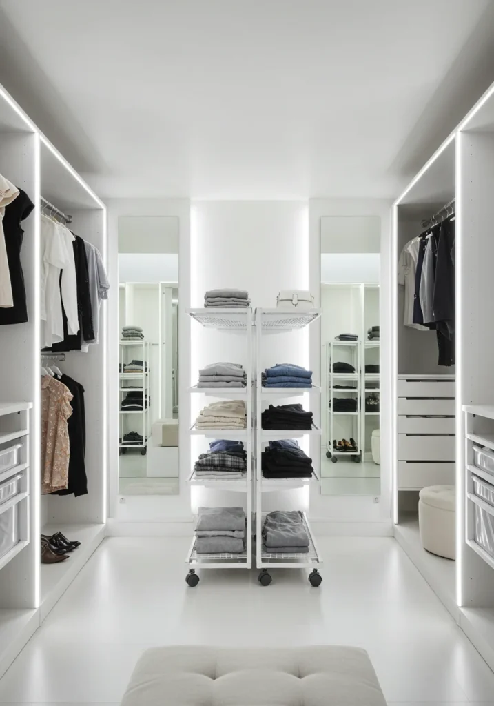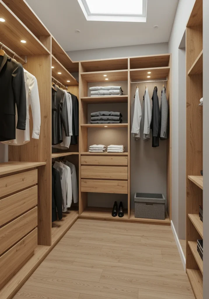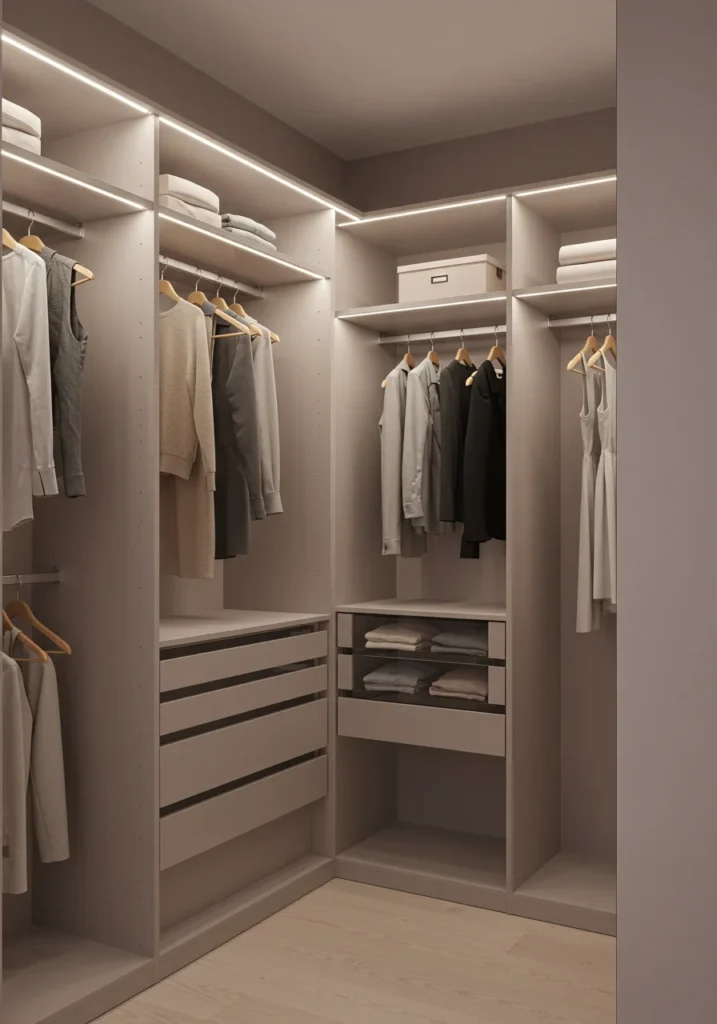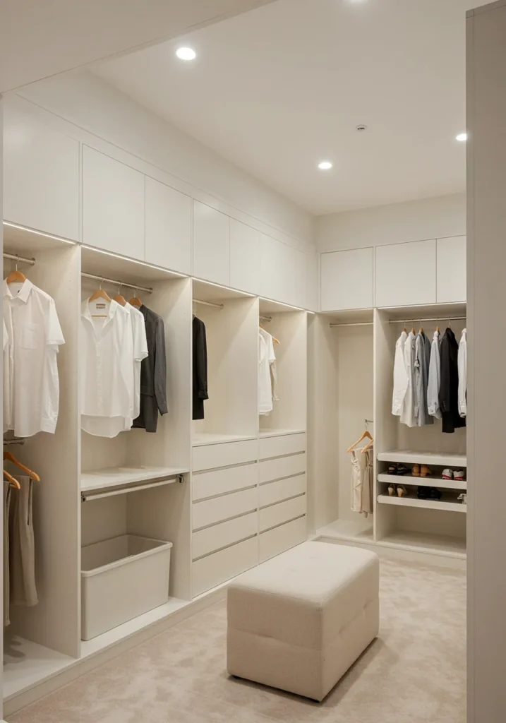 A compact walk-in closet with U-shaped shelving brings luxury to small spaces by surrounding you with storage on three sides. Though smaller in scale than traditional walk-ins, this layout optimizes organization with shelves, drawers, and hanging rails positioned for easy access. The U-shape maximizes every corner, turning a small footprint into a functional dressing zone. With the addition of LED lighting and mirrors, it feels spacious and boutique-like. Perfect for those who love a walk-in experience but lack extra room, this design offers a stylish and efficient storage solution, blending elegance and practicality into even the tiniest bedroom.