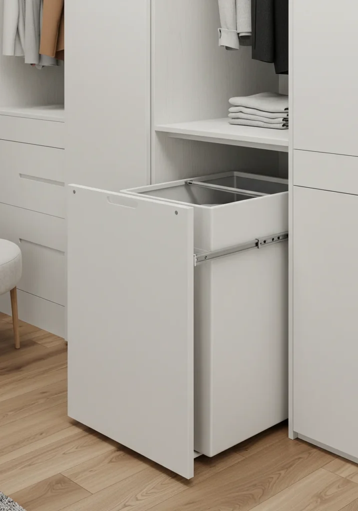 A closet with a built-in laundry hamper is a brilliant way to streamline small-space living. Discreetly tucked inside a drawer or cabinet, the hamper keeps dirty laundry out of sight while maintaining a clean, organized look. This integrated feature saves floor space and eliminates the need for bulky standalone baskets. Ideal for bedrooms, apartments, or shared spaces, it combines storage and convenience in one compact design. Ventilated or removable bins make laundry day easy, while sleek finishes keep the design polished. Functional yet stylish, a built-in hamper adds practical efficiency to any small closet, enhancing everyday organization.