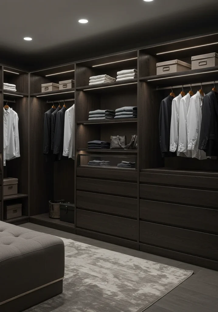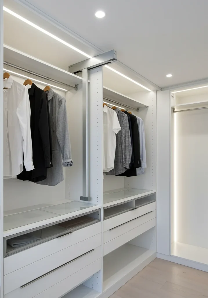 Closets with LED lighting add both functionality and style, especially in small spaces where natural light is limited. Integrated LED strips along shelves, rods, or door frames ensure every corner is well-lit, making clothes and accessories easy to find. Energy-efficient and customizable, LEDs can offer warm or cool tones to match the room’s atmosphere. Motion sensor lighting adds convenience, illuminating the closet only when in use. Sleek and modern, this feature enhances the overall aesthetic while improving daily usability. Perfect for compact closets, LED lighting elevates storage design by combining practicality, elegance, and a touch of luxury.
