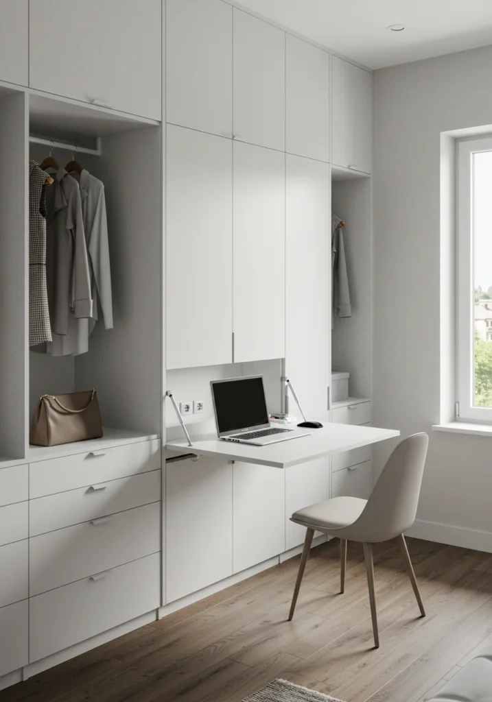 A closet with a fold-down desk is the ultimate multifunctional solution for small spaces. When closed, the desk blends seamlessly into the closet, maintaining a clean and organized look. When opened, it provides a functional workspace complete with shelves and storage. Perfect for apartments, studios, or guest rooms, this design allows one area to serve as both a closet and a home office. Compact, efficient, and modern, it maximizes usability without sacrificing style. Ideal for remote workers or students, this closet design proves that small spaces can be both highly practical and beautifully versatile.