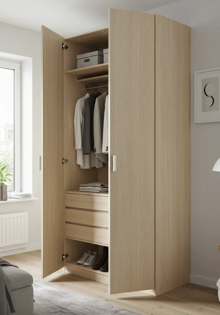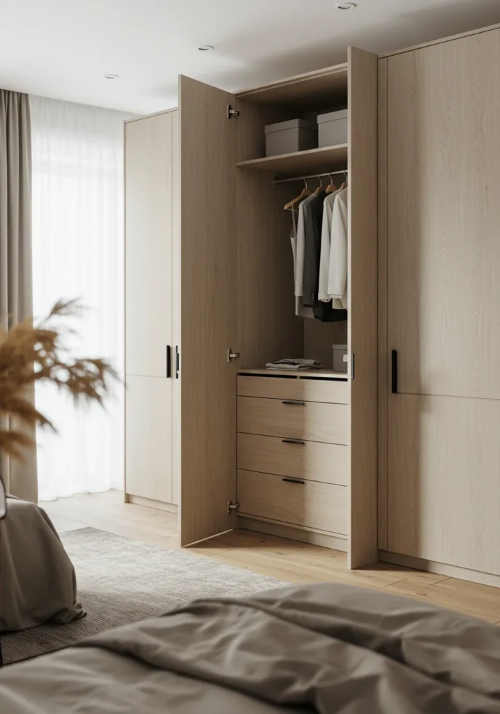A minimalist wardrobe closet with a slim vertical design is ideal for narrow spaces. Tall and streamlined, it makes use of vertical height rather than floor area, offering space for hanging clothes, stacking shelves, and hidden drawers. Its clean lines and simple finishes create a clutter-free aesthetic that complements modern, Scandinavian, or minimalist interiors. Often finished in white, light wood, or matte tones, it blends seamlessly with the surrounding décor. Perfect for apartments and smaller homes, this closet design maximizes storage while maintaining an airy, spacious look. It’s a practical solution for those who prefer sleek style and efficiency.