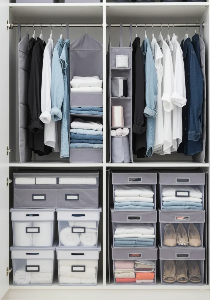 A closet with vertical dividers is a clever way to keep folded clothes neat and accessible in small spaces. Dividers create individual compartments, preventing stacks from toppling over and making it easy to find specific items. Adjustable designs allow for customization, accommodating sweaters, jeans, or t-shirts. This setup works well in built-in closets, open shelving, or compact wardrobes. Perfect for maximizing narrow spaces, vertical dividers keep everything tidy while enhancing the closet’s efficiency. Paired with baskets or labeled bins, the design makes organizing effortless. Functional, space-conscious, and stylish, vertical dividers transform small closets into orderly, streamlined storage solutions.