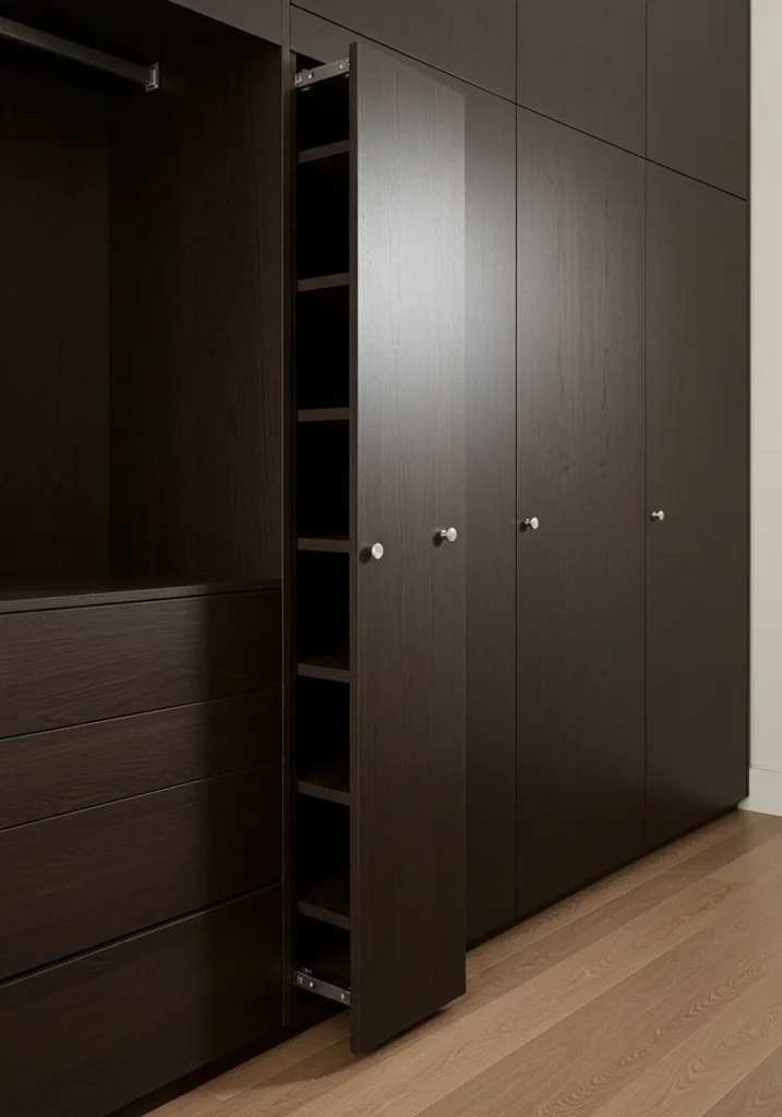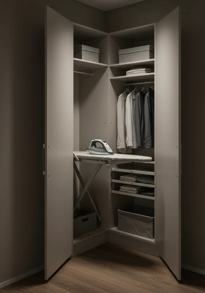 A compact closet with a fold-out ironing board is the ultimate space-saving solution for small bedrooms or apartments. Integrated neatly into the design, the ironing board folds out when needed and tucks away when not in use. This multifunctional feature ensures convenience without clutter, making it perfect for busy lifestyles. Combined with shelves, drawers, and hanging rods, the closet provides efficient storage while adding utility. Sleek finishes and concealed fittings keep the look modern and streamlined. This smart, all-in-one design transforms small spaces into highly functional areas, proving that practicality and style can coexist seamlessly in compact interiors.