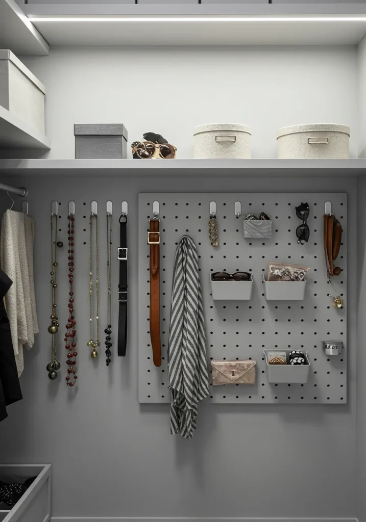 A closet with hooks and pegboards is an ingenious way to organize accessories in small spaces. Pegboards allow you to customize the layout, adding hooks, baskets, or shelves for items like hats, bags, or jewelry. This design keeps essentials visible and easy to access while freeing up shelves and drawers for clothing. Perfect for compact bedrooms, entryways, or multipurpose closets, it brings versatility and efficiency. The pegboard can be painted or styled to complement the décor, adding a creative touch. Affordable, flexible, and highly functional, this idea proves that even the smallest closets can be organized with style.