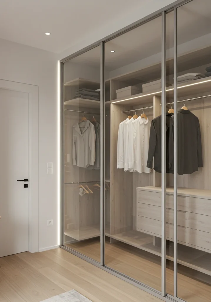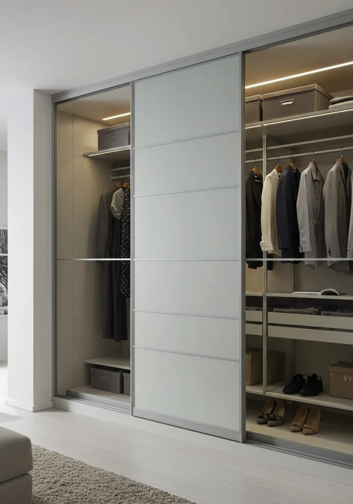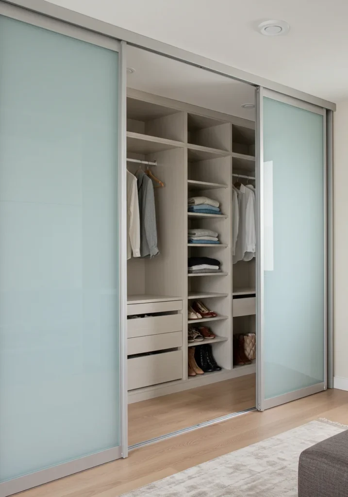 A closet with sliding frosted glass panels blends modern elegance with practicality, making it perfect for small spaces. The frosted finish offers privacy while allowing light to filter through, keeping the room feeling airy and spacious. Sliding panels save valuable floor space compared to hinged doors, making them ideal for compact bedrooms or apartments. Inside, customizable shelving, hanging rods, or drawers provide organized storage for clothes and accessories. The sleek glass surface adds a contemporary edge while complementing minimalist, Scandinavian, or luxury interiors. Functional and stylish, frosted glass closets elevate storage design while maintaining a clean, sophisticated aesthetic.