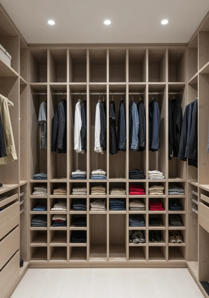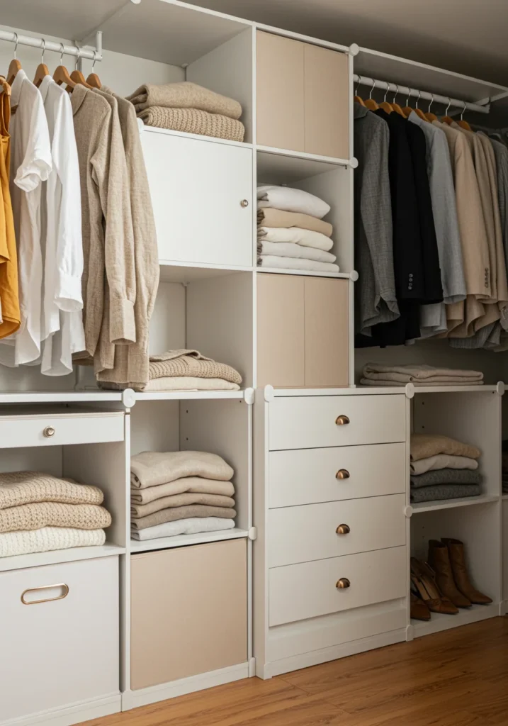 A closet with modular cube organizers is a flexible solution for small spaces, allowing complete customization. The cubes can be stacked, rearranged, or combined to fit any layout, making them perfect for apartments, dorms, or bedrooms. Ideal for storing clothes, shoes, or accessories, they keep everything visible and tidy. Fabric, wood, or acrylic finishes let them blend with different décor styles, from modern minimalism to cozy casual. This design grows with your needs, offering long-term adaptability. Functional, affordable, and stylish, modular cube organizers transform cramped closets into versatile and efficient storage systems that maximize every inch.