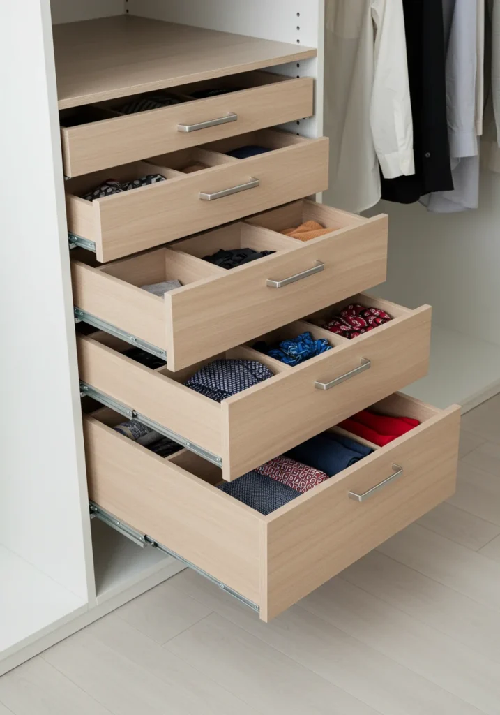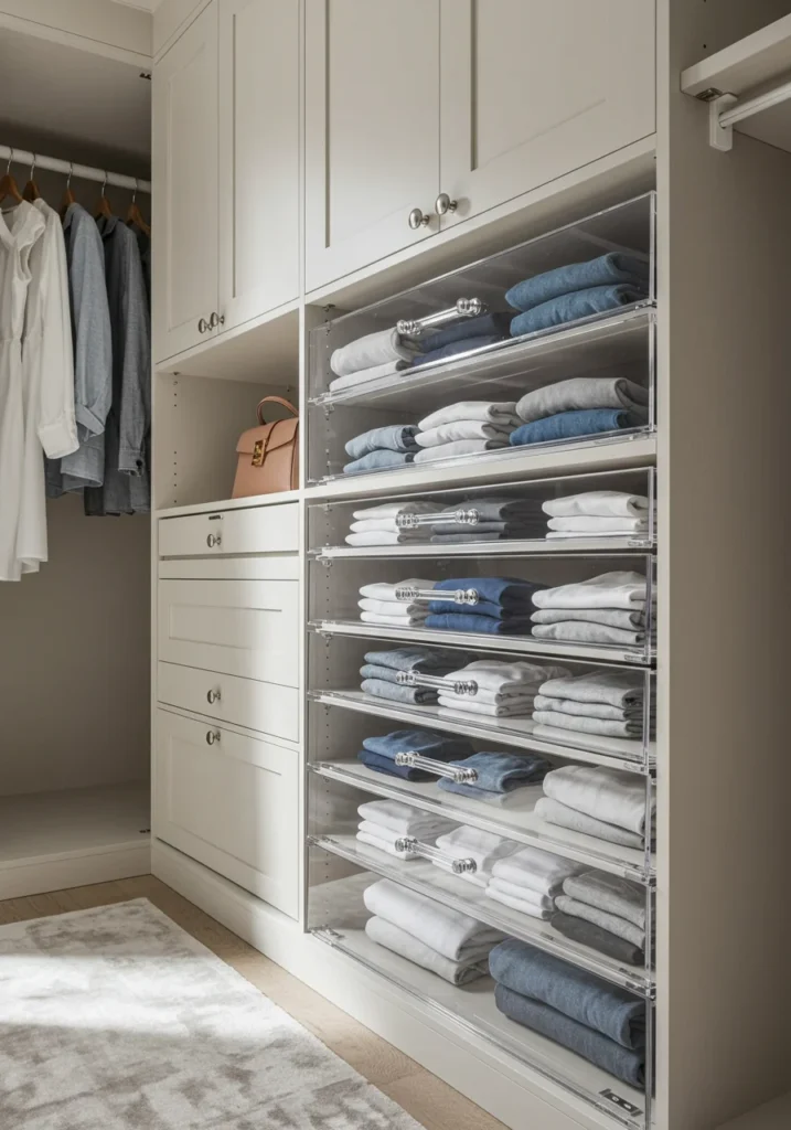 A closet with transparent acrylic drawers is a sleek and functional option for small spaces. The clear material allows you to see contents instantly, reducing clutter and saving time when getting ready. Lightweight yet durable, acrylic drawers are ideal for storing accessories, folded clothes, or shoes. Their modern look pairs well with minimalist, contemporary, or Scandinavian interiors. Compact in size, they can be stacked or integrated into a built-in closet design. This storage solution is especially useful in tight spaces, keeping everything organized and visually accessible. Practical and chic, acrylic drawers elevate small-space closets with style and efficiency.