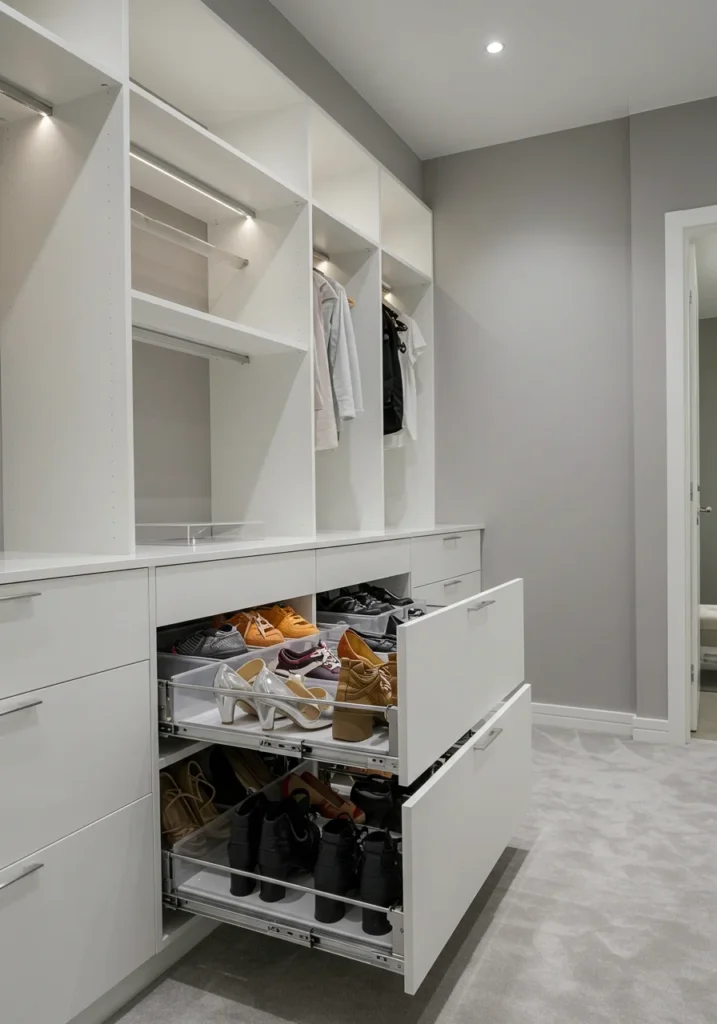 A closet with retractable shoe drawers is perfect for small spaces where every inch matters. These pull-out compartments keep shoes neatly stored and hidden while maximizing depth. Retractable drawers make it easy to view and access footwear without cluttering the floor. Designed in wood, metal, or acrylic finishes, they fit seamlessly into modern closets, adding both style and practicality. Perfect for bedrooms, entryways, or compact apartments, they ensure shoes stay organized and protected. This space-saving design elevates storage while maintaining a sleek, minimalist appearance, offering an efficient solution that blends functionality with a polished, contemporary look.