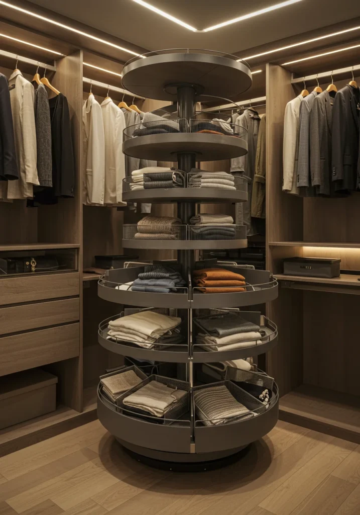 A closet with a rotating carousel system is a high-tech, space-saving solution for small spaces. The rotating mechanism allows clothes, shoes, or accessories to be accessed effortlessly with a simple turn, making the most of tight areas. Ideal for wardrobes, walk-in closets, or compact bedrooms, this system eliminates wasted corners and maximizes vertical storage. Combined with smart lighting, it offers a sleek, modern touch while improving functionality. Though innovative, it remains stylish and adaptable to various interior designs. Perfect for those seeking luxury in compact living, carousel storage proves small closets can be both futuristic and highly efficient.