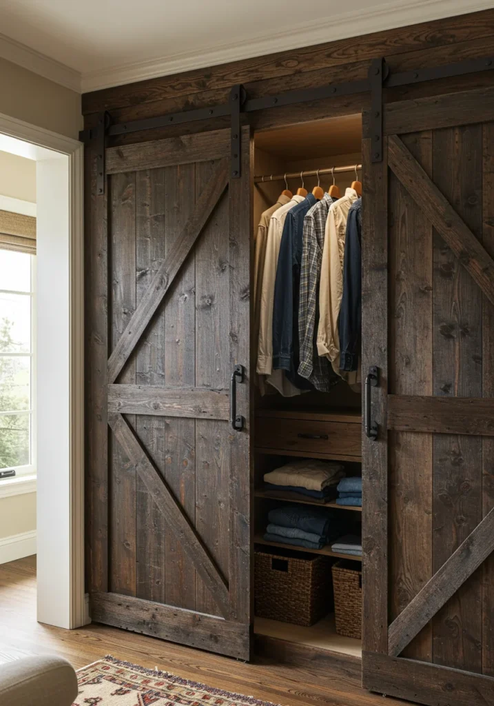 A closet with sliding barn doors combines rustic charm with space-saving design, making it ideal for small bedrooms. Unlike traditional swinging doors, barn doors slide along a track, requiring no clearance. Crafted from reclaimed or distressed wood, they bring texture and warmth to interiors while concealing storage neatly. Inside, shelves, rods, and drawers can be customized for efficient organization. The barn door aesthetic adds character, making the closet a stylish focal point. Perfect for farmhouse, industrial, or eclectic interiors, this design merges practicality with personality, proving that even small spaces can enjoy both functionality and a touch of rustic elegance.