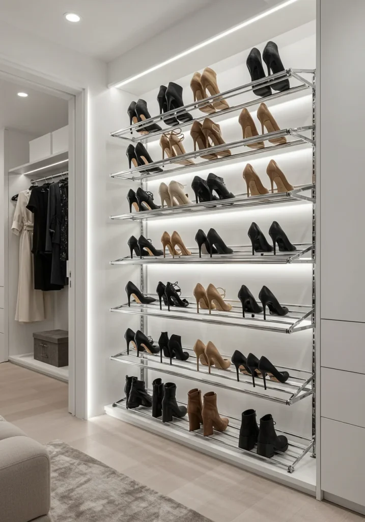 A closet with tiered shoe racks is ideal for maximizing storage in small spaces while keeping footwear neatly displayed. Tiered racks allow shoes to be stacked vertically, saving floor space and improving accessibility. Whether built-in or freestanding, they help organize everything from heels to sneakers in a visually pleasing way. Metal, wood, or acrylic finishes can match various interiors, while adjustable tiers accommodate different shoe sizes. Perfect for bedrooms, entryways, or walk-in closets, this design ensures every pair has its place. Stylish, practical, and efficient, tiered racks bring order and elegance to compact closets without compromising functionality.