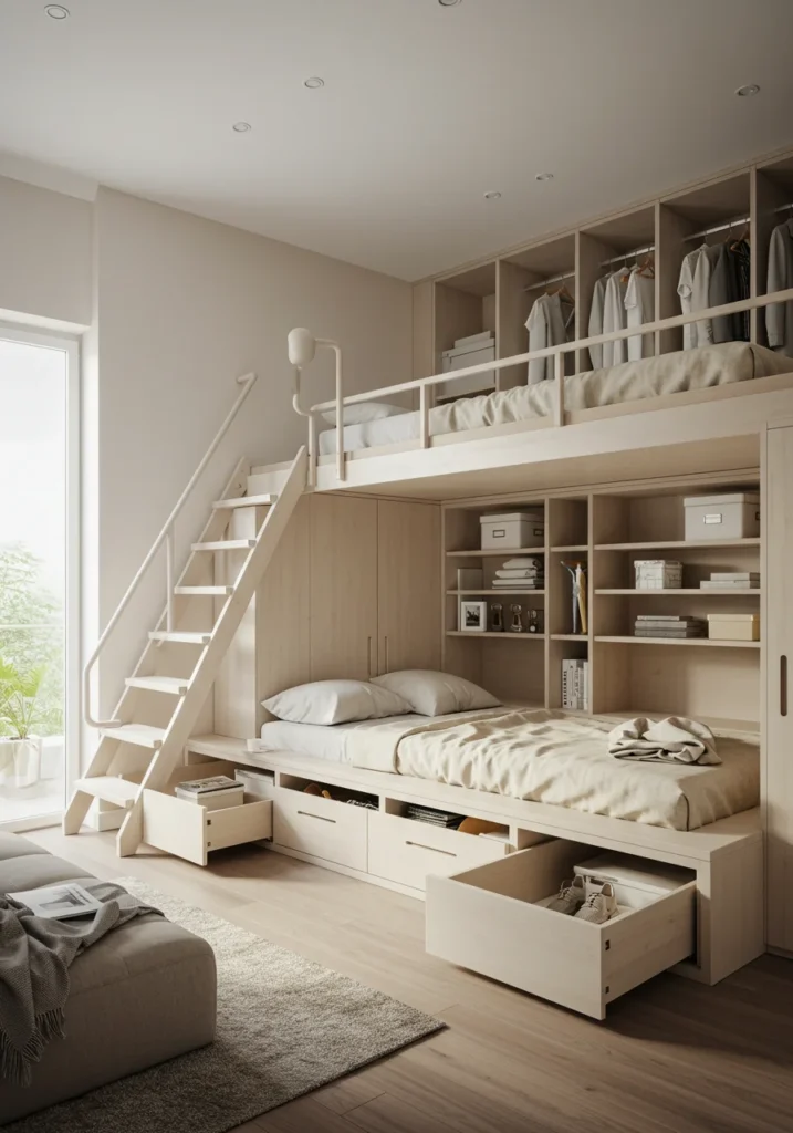 A lofted closet with storage under a raised bed transforms small bedrooms into highly efficient living spaces. By elevating the bed, the area underneath becomes prime real estate for a closet with shelves, rods, and drawers. This design maximizes vertical space, keeping the floor area open for other uses. Perfect for studio apartments or kids’ rooms, it blends sleeping and storage zones seamlessly. Curtains or sliding doors can conceal the closet, maintaining a tidy appearance. Ideal for modern compact living, this design offers a smart balance between comfort and organization, ensuring that no inch of valuable space is wasted.