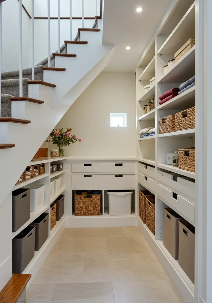 An under-stair closet makes clever use of an often-overlooked area in small homes. By converting the space beneath a staircase into a closet, you gain valuable storage without taking up extra room. Custom shelving, pull-out drawers, or hanging rails can be built into the angled design, ensuring every inch is utilized. Ideal for storing shoes, coats, or even seasonal items, it blends functionality with architectural interest. Doors can be added for a sleek finish, or left open for a display-style look. Perfect for maximizing small interiors, an under-stair closet turns unused space into a stylish, practical storage solution.
