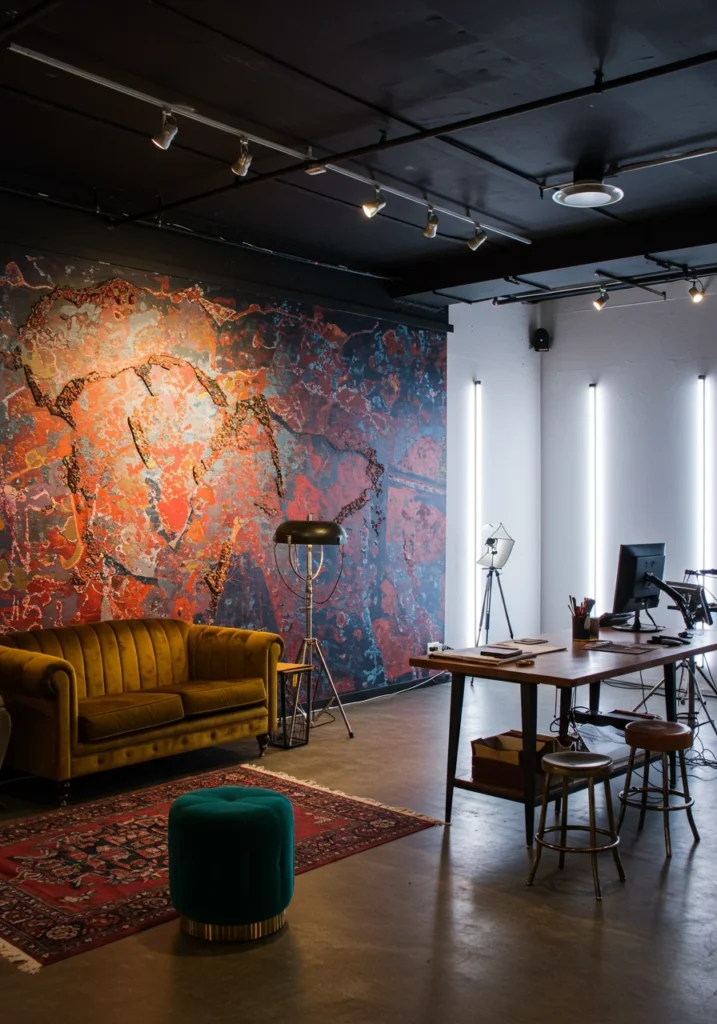 Artistic studio space with colorful mural and creative lighting