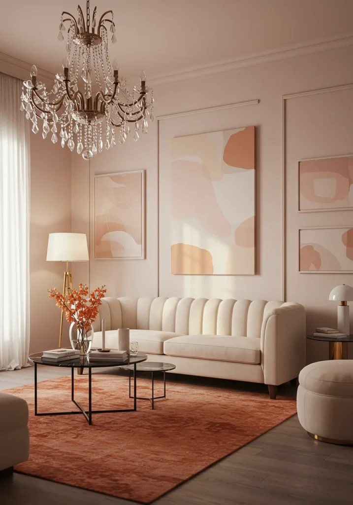 Chic living room with crystal lighting and soft pastel tones
