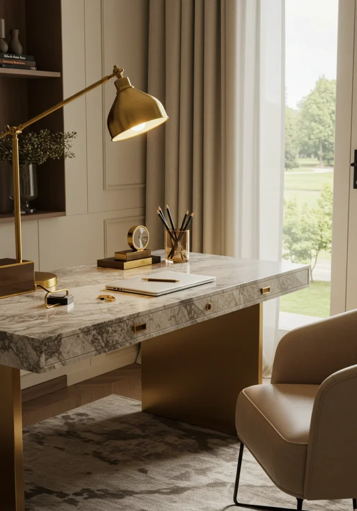 Classy home office with marble desk and brass lamp