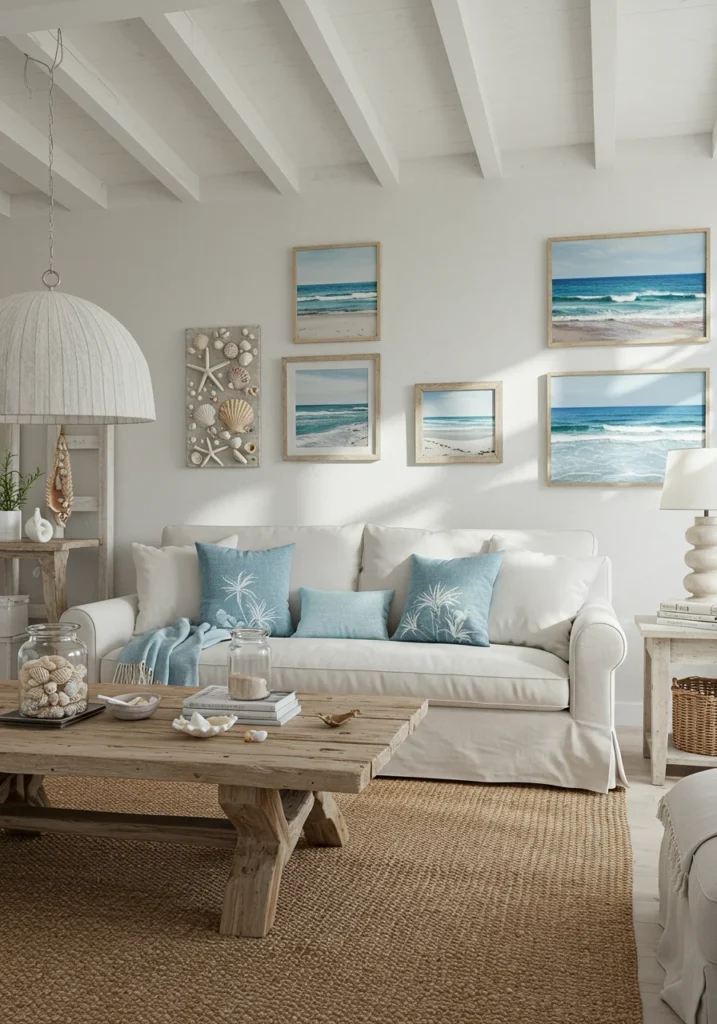 Coastal-inspired room with whitewashed walls and driftwood accents