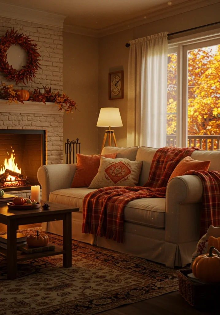 Cozy fall-inspired living room with plaid blankets and warm lighting