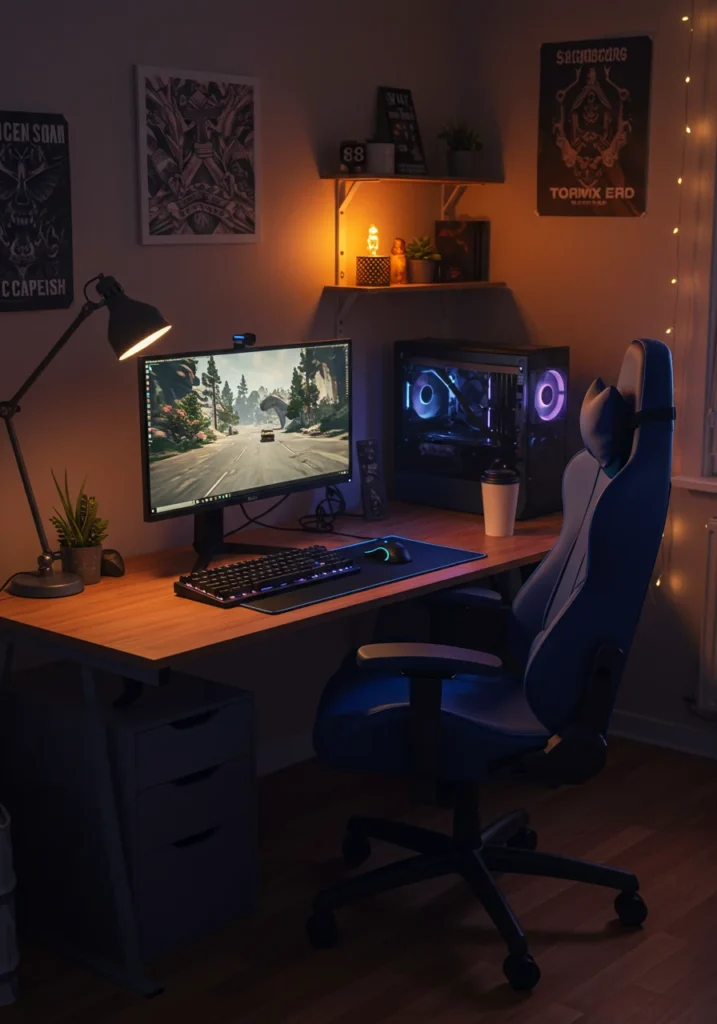 Cozy gamer setup with RGB lighting and ergonomic furniture