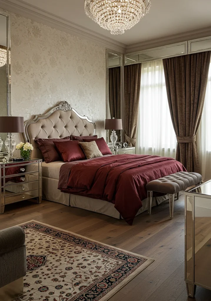 Glamorous master suite with mirrored furniture and silk bedding