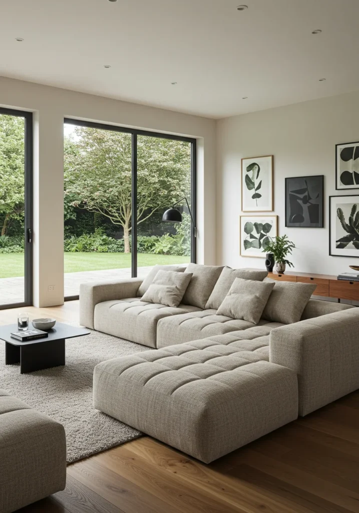 Modern family room with modular sofa and large glass doors