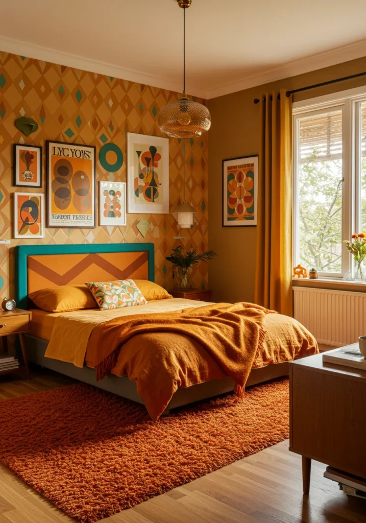 Retro-inspired bedroom with 70s colors and geometric decor