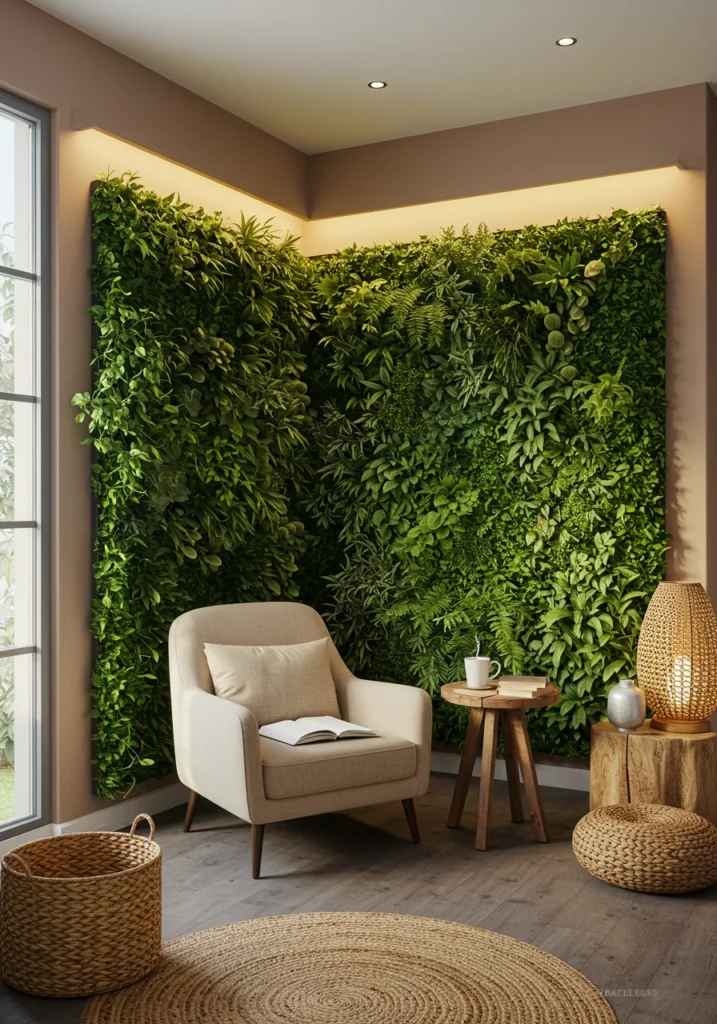 Serene reading corner with greenery wall and natural textures