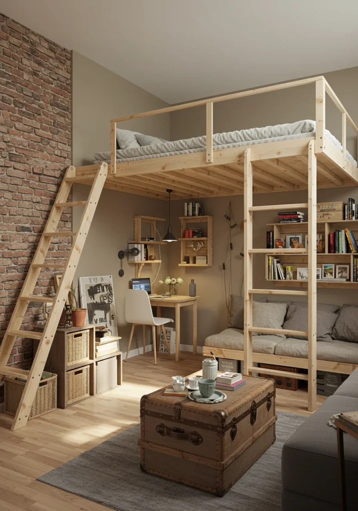 Studio apartment room with loft bed and creative storage