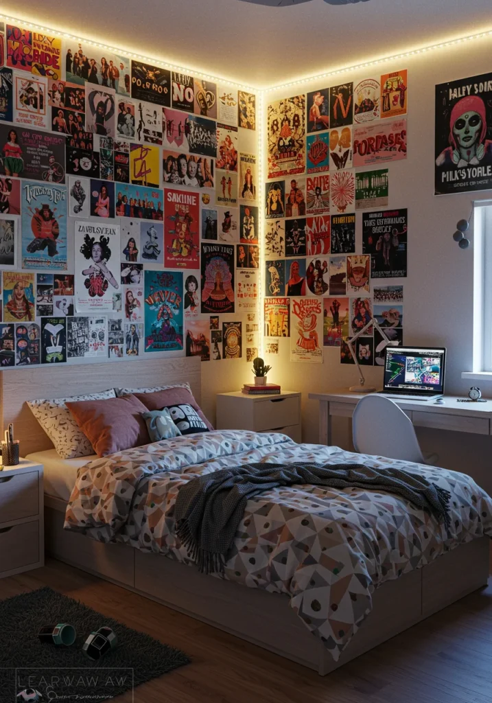 Teen bedroom makeover with LED lights and wall collages