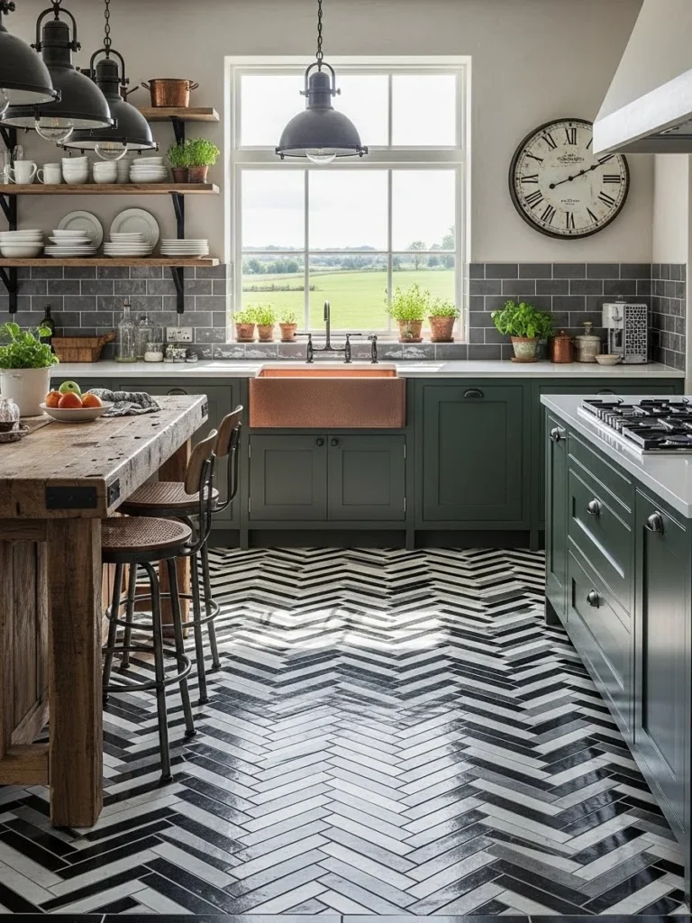 16. Bold farmhouse kitchen ideas with patterned flooring