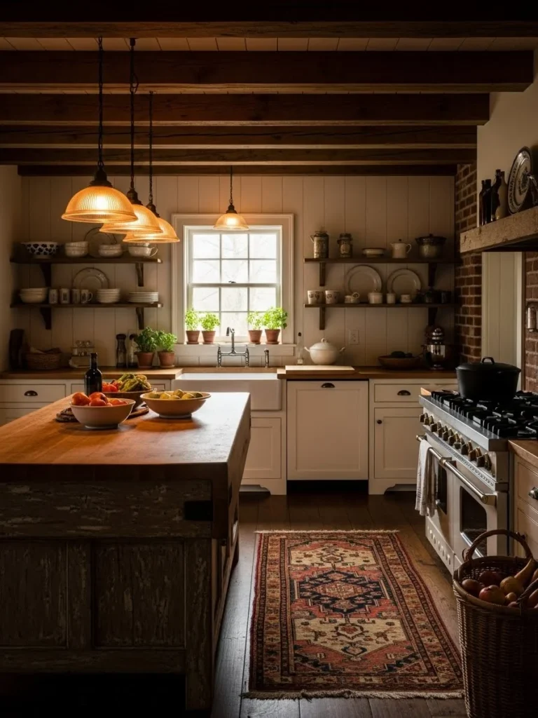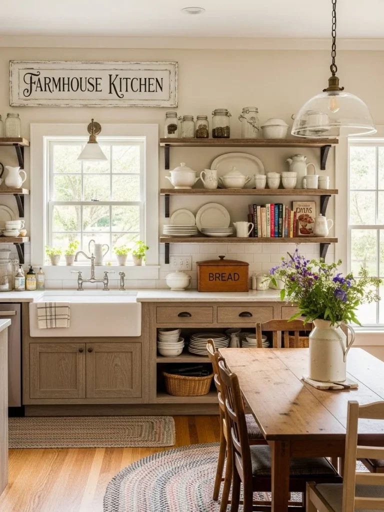 Vintage décor enhances this appeal, introducing character and nostalgia through antique finds, weathered finishes, and handcrafted pieces. Elements such as vintage signage, old crockery, or repurposed wooden crates become functional decorative pieces within the space. These touches complement natural materials and classic farmhouse color palettes beautifully.