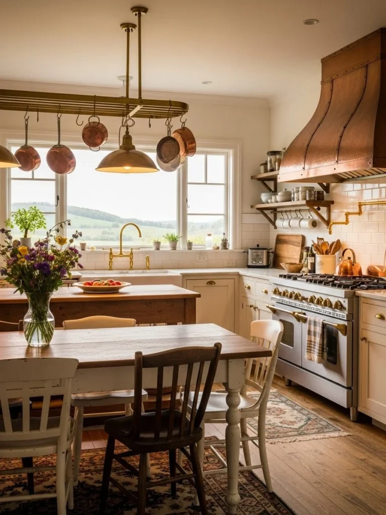 Farmhouse kitchens featuring copper or brass fixtures introduce warmth, elegance, and a hint of vintage charm. These metallic accents pair seamlessly with the natural textures and soft color palettes that define farmhouse style. Their warm tones enhance the overall ambiance, creating a refined yet inviting atmosphere.
