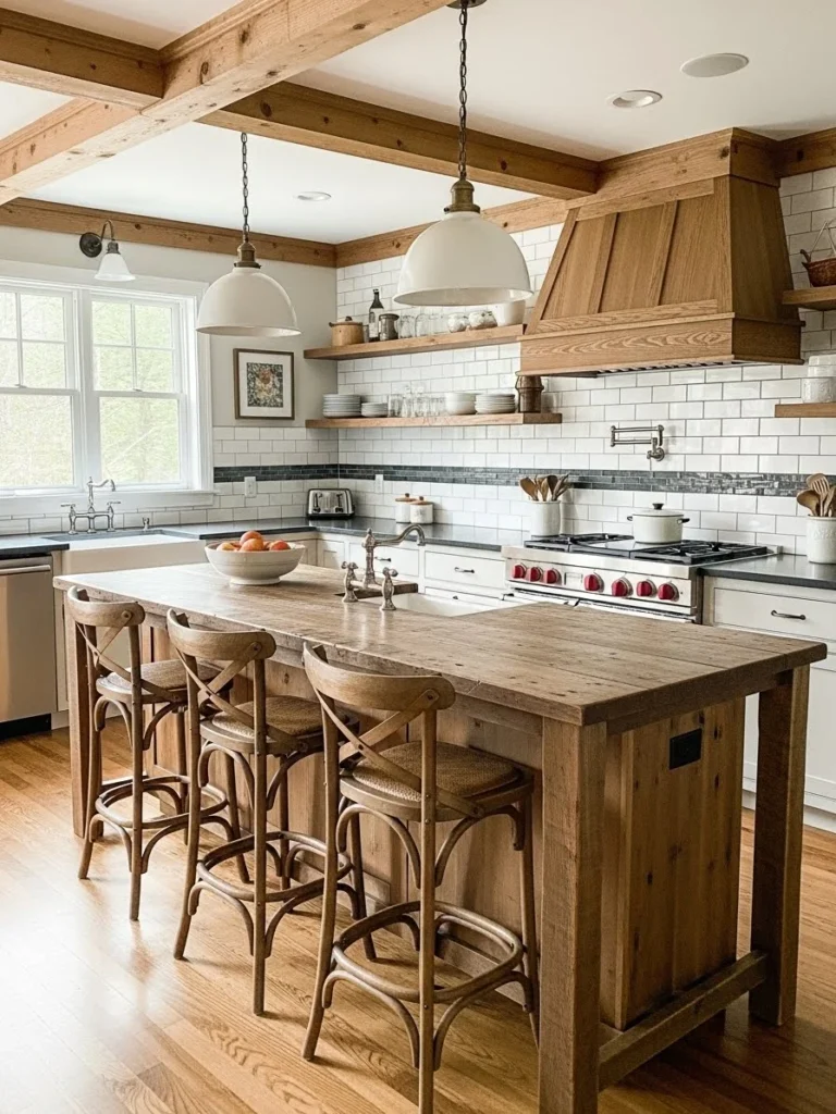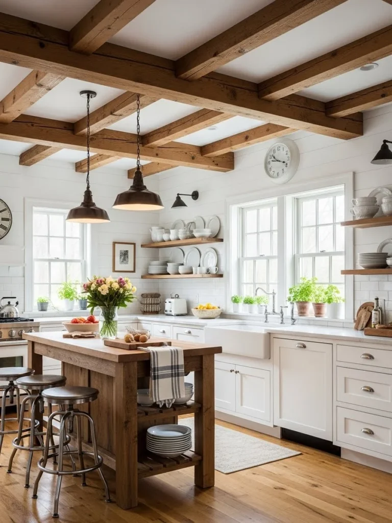 White farmhouse kitchens with wooden beams feel both airy and grounded, making them ideal for homes seeking a timeless yet inviting atmosphere. The contrast of white surfaces with rich wood tones creates a balanced design that remains elegant, functional, and effortlessly beautiful year after year.