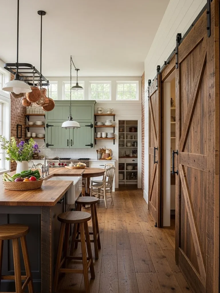 Barn-style sliding doors are a standout feature in farmhouse kitchens, offering both functionality and rustic charm. These doors add architectural interest while saving space, making them a practical alternative to traditional swinging doors. Their distinct style enhances the authentic farmhouse ambiance and provides a striking visual centerpiece.